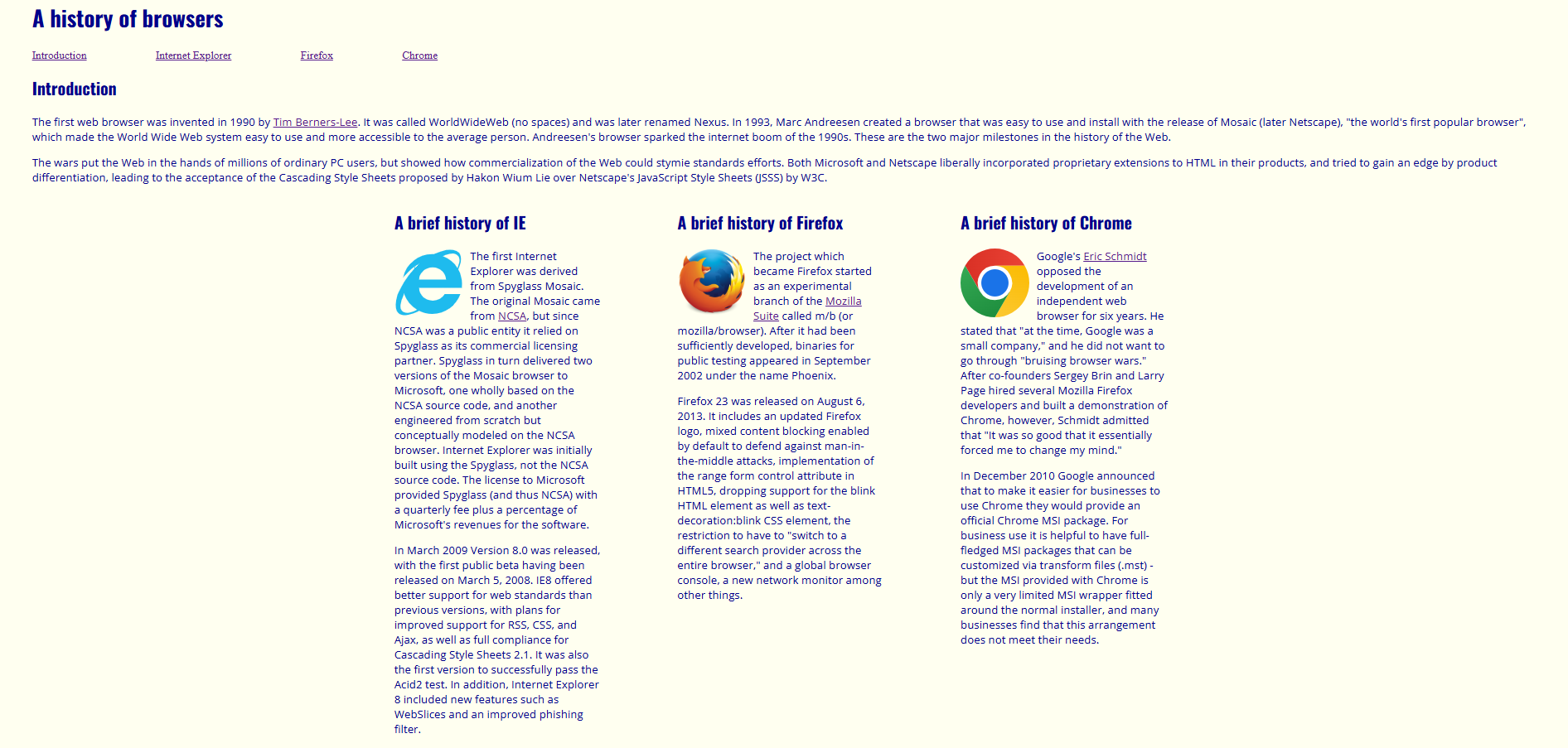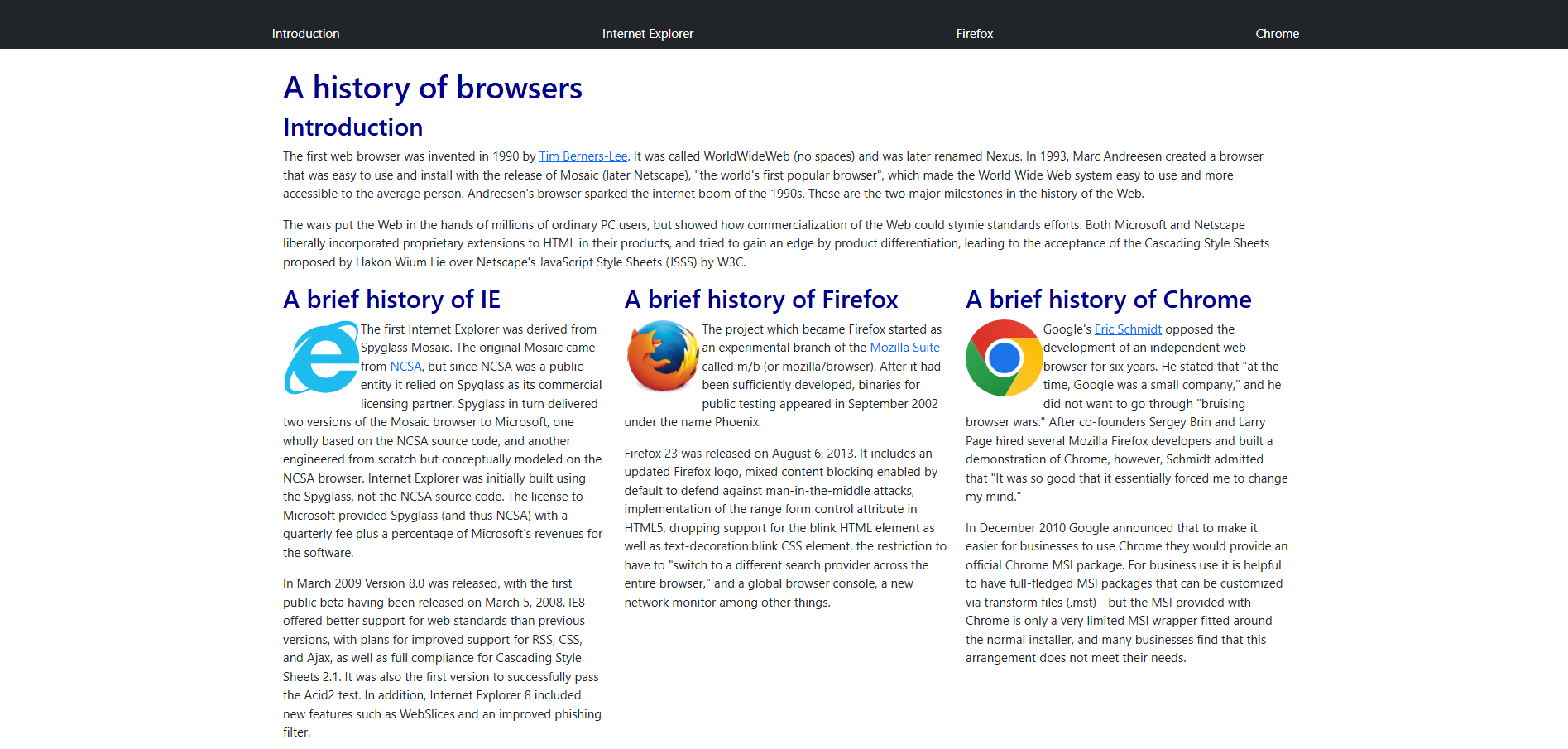 As a beginner in HTML, I found formatting a web page challenging, especially when working with margins and layouts. Manually styling and aligning each section through plain HTML and CSS became tedious. When I recreated the same webpage but using Bootstrap 5, I noticed improvement in efficiency and readability though it required a little effort understanding how the features worked. The built in rows and columns classes allowed me to structure the three paragraphs into columns more easily since it eliminated the need to adjust the margins in a separate CSS file.